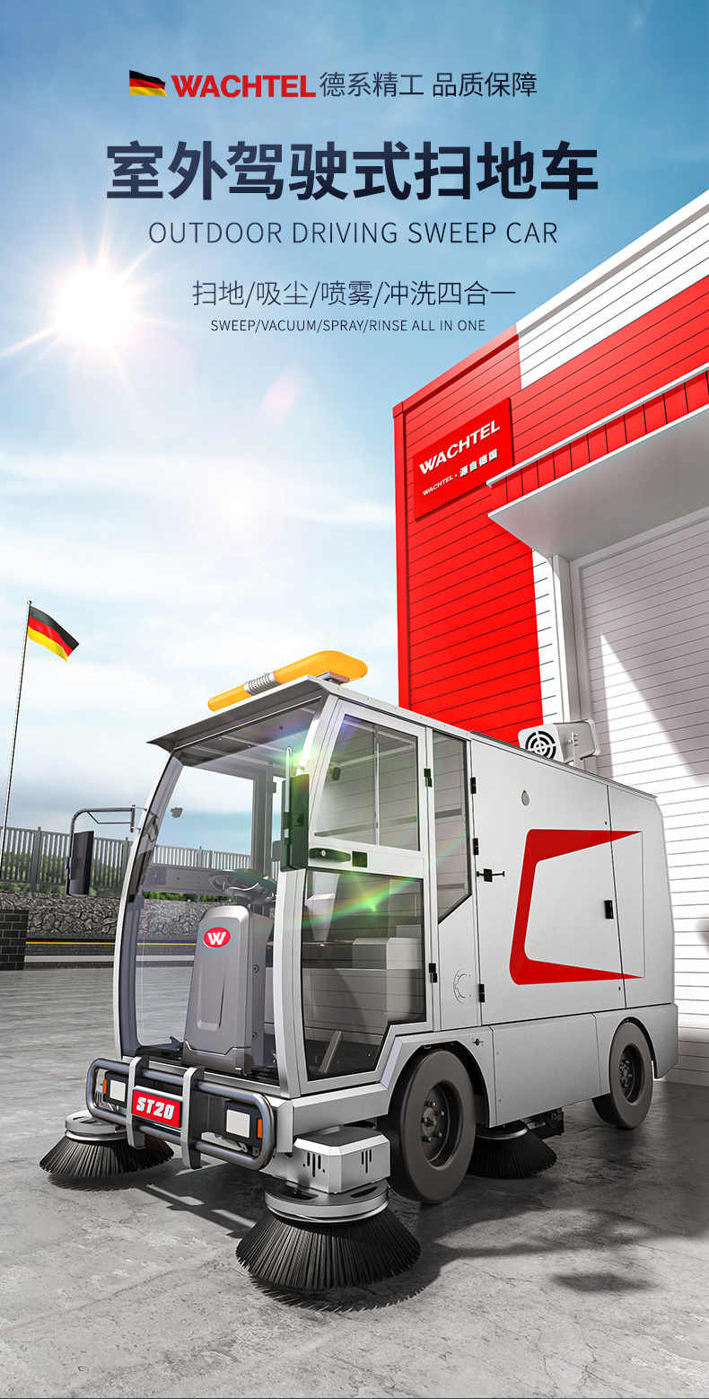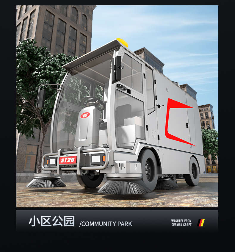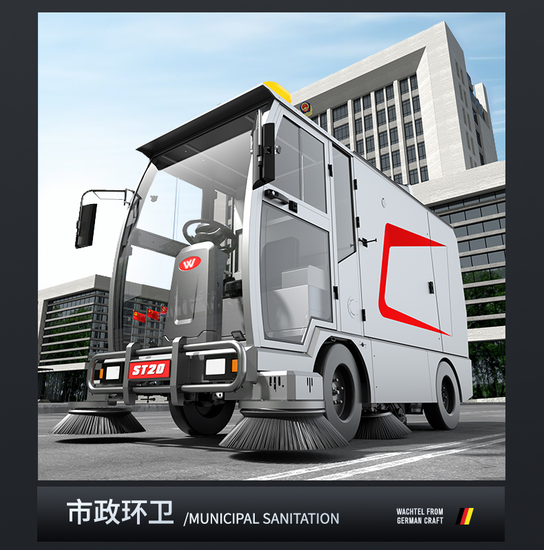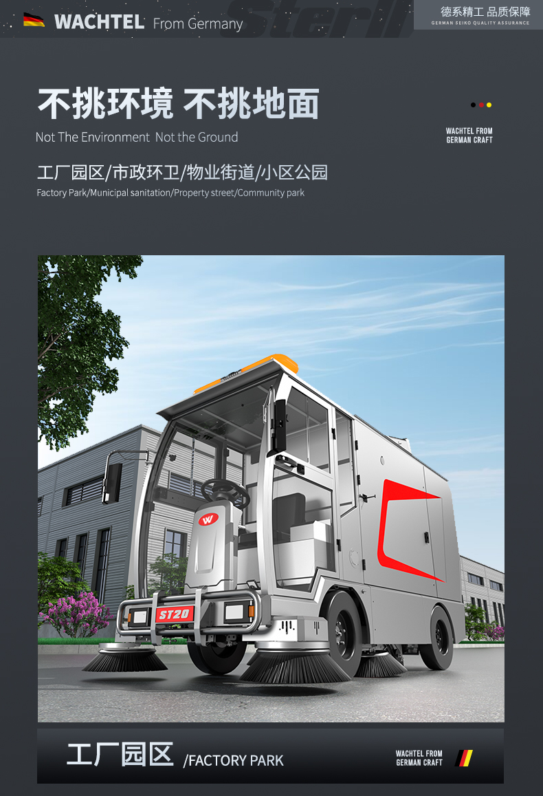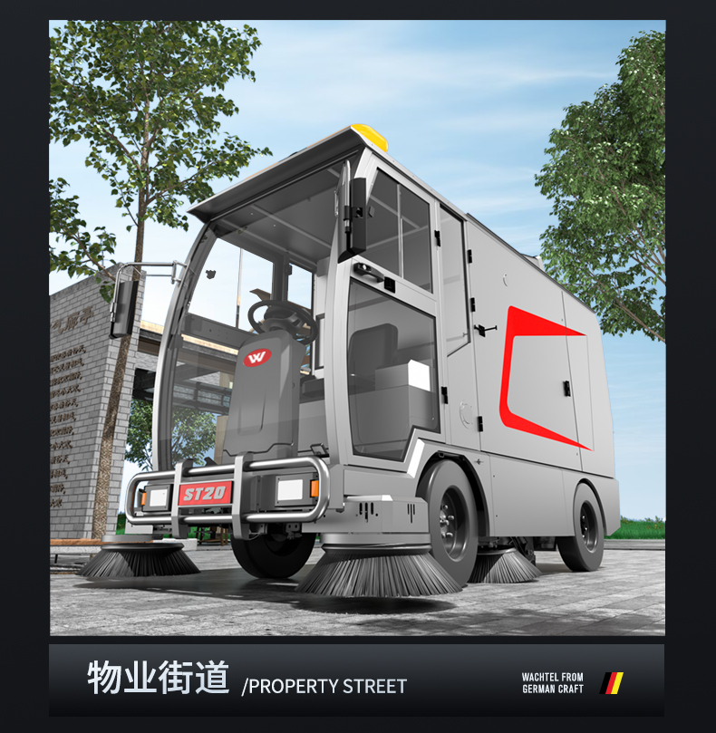 品牌:WACHTEL 名稱:電動環衛四輪掃地機 型號: ST20 清掃寬度:1500 mm——2500 mm 清潔效率:26000m²/h 工作時間:6~8h 電池:意大利OM鋰電 電機:德國瓦赫電機 適用清潔場所: 園區、廠區、道路、車間、小區等