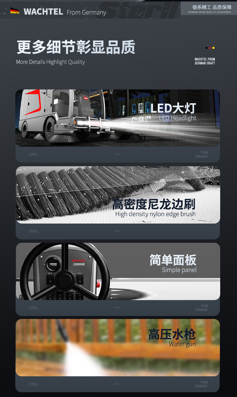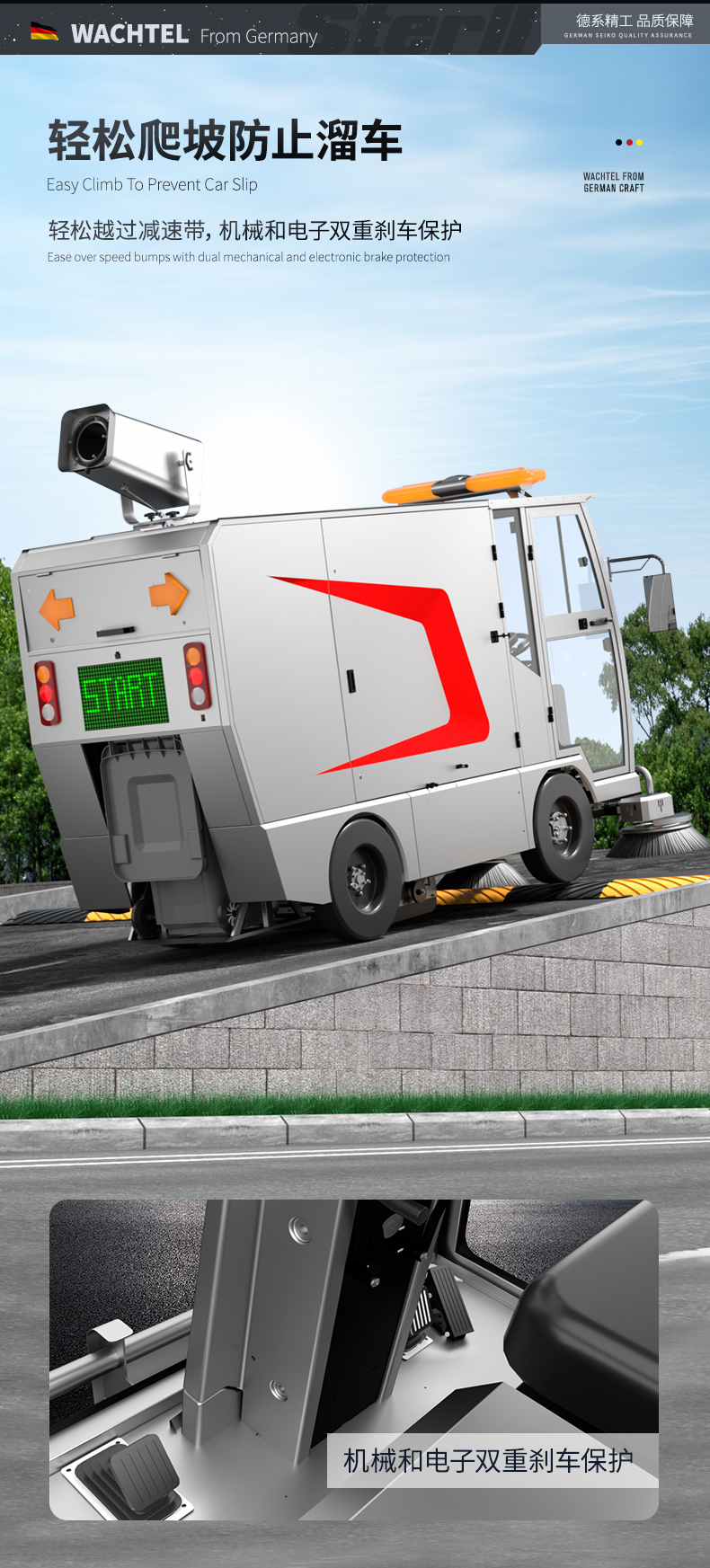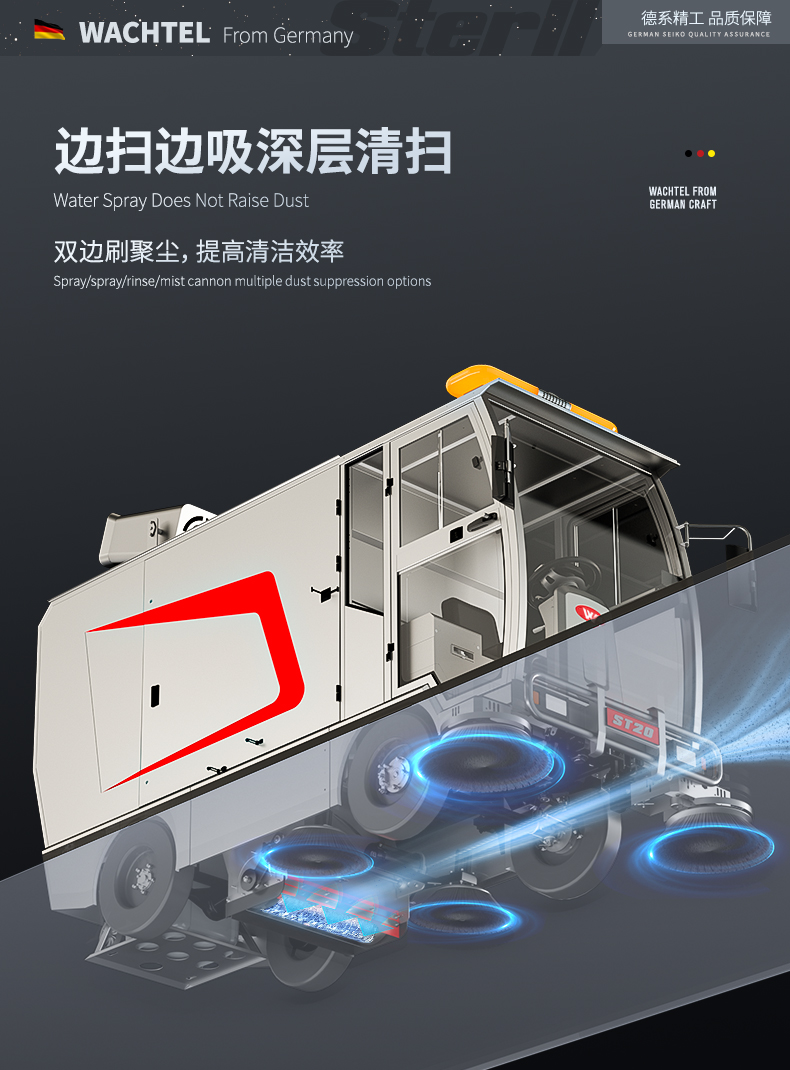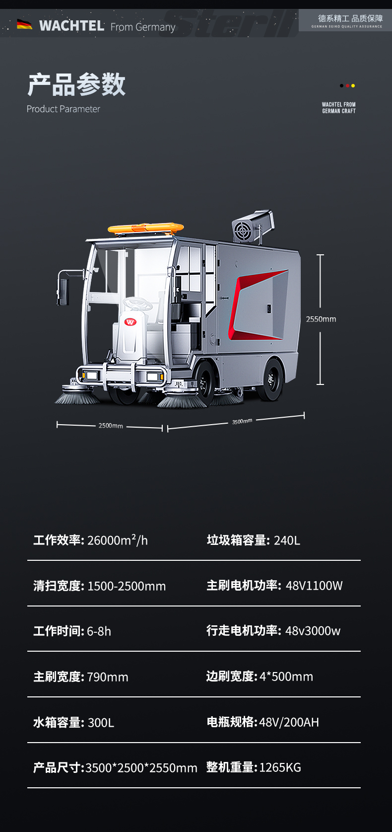品牌:WACHTEL 名稱:電動環衛四輪掃地機 型號: ST20 清掃寬度:1500 mm——2500 mm 清潔效率:26000m²/h 工作時間:6~8h 電池:意大利OM鋰電 電機:德國瓦赫電機 適用清潔場所: 園區、廠區、道路、車間、小區等