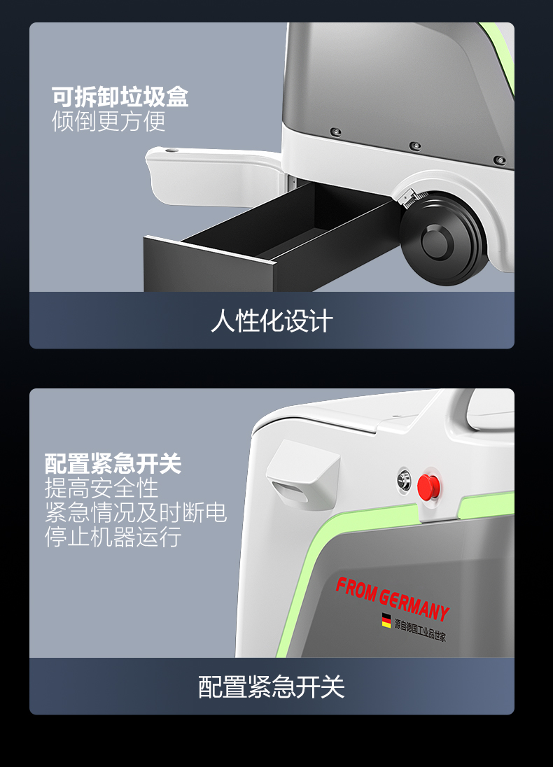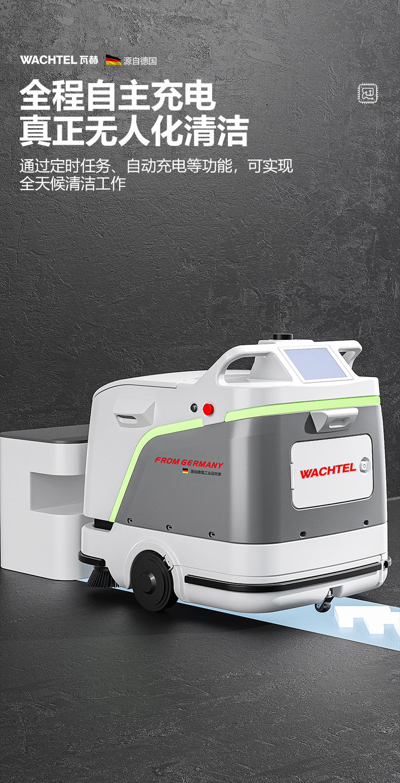 品牌:WACHTEL 名稱:掃拖吸一體智能機器人 型號:SW800 功能:掃地+洗地+吸塵+塵推 特點:自動充電+自動避讓+自動乘梯+斷點續掃 控制方式:自動/人工 外觀尺寸: 1020*847*915mm 充電樁尺寸:430*290*440mm 清潔寬度:600 mm 塵推寬度:800 mm 清潔效率:2300m²/h 工作時間:4h 工作噪音:≤63dB 電池:24V/50AH/100AH鋰電池 重量:150kg 防護措施:激光雷達+超聲探頭+深度攝像頭