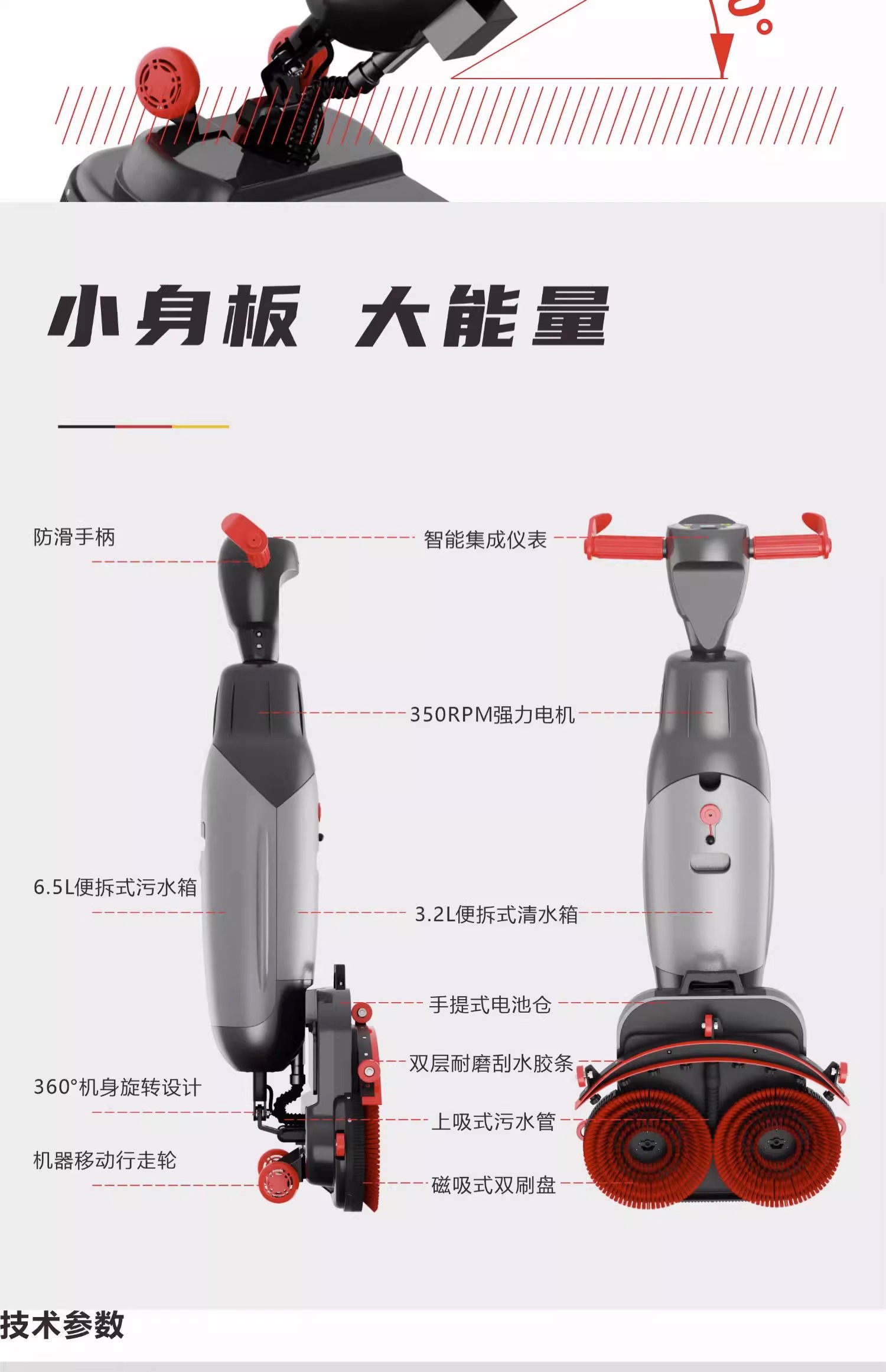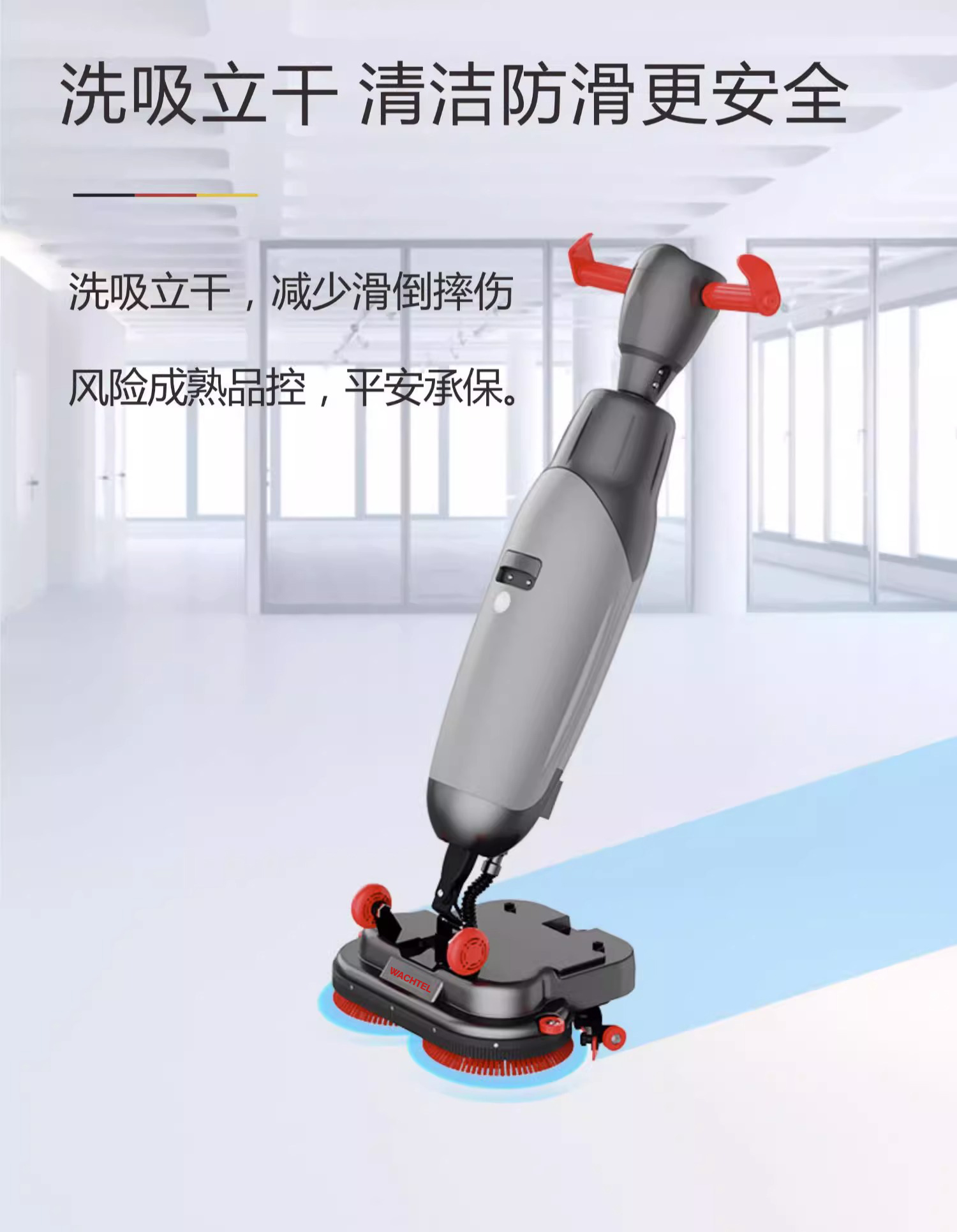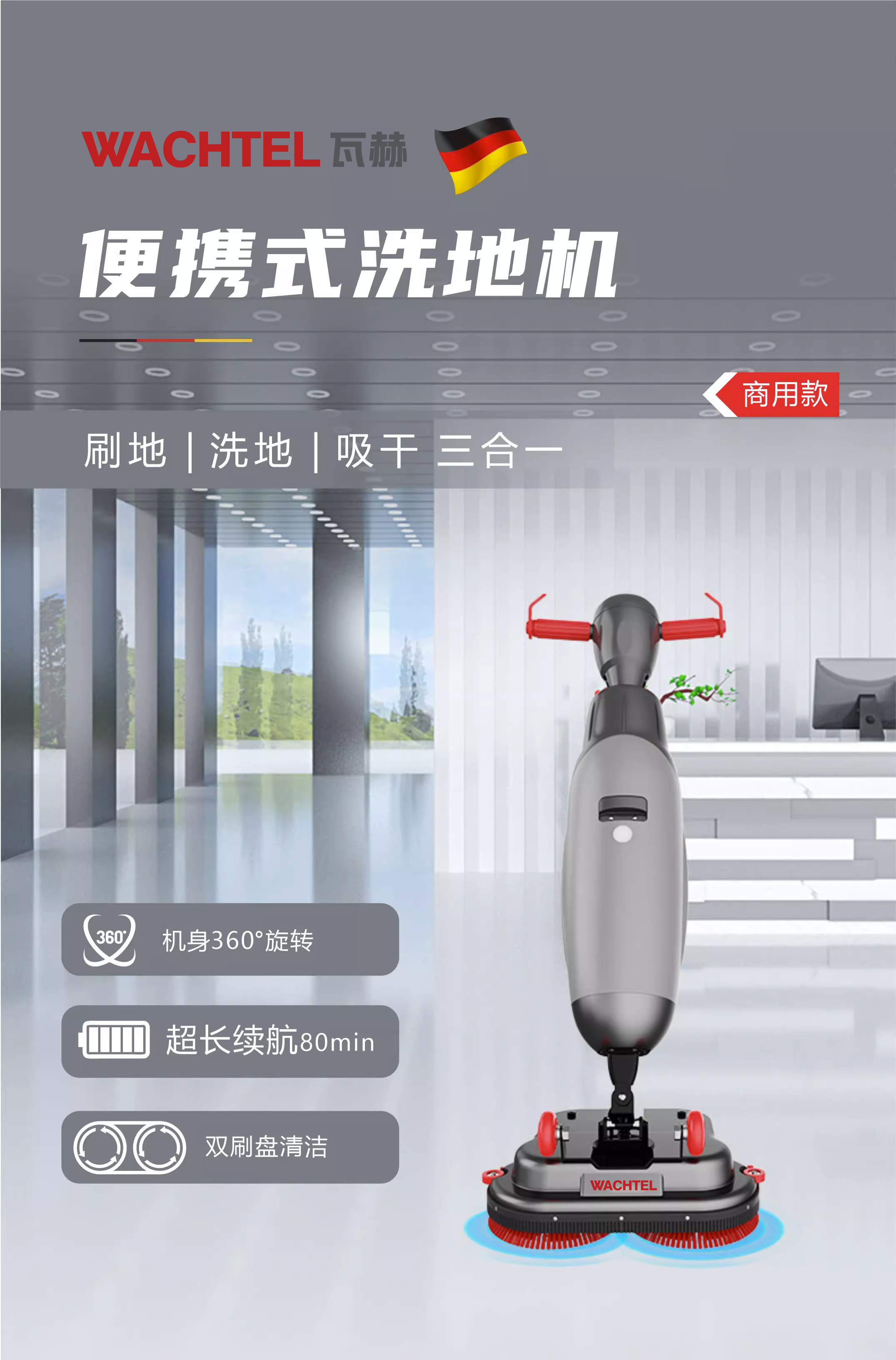 品牌:WACHTEL 名稱:小型便攜式洗地機 型號: SX430 清掃寬度:430 mm(雙刷盤) 清潔效率:1200m²/h 工作時間:1.5h 水箱容量:4L/6.5L(清/污) 電池:意大利OM鋰電 電機::德國瓦赫電機 整機重量:18.4kg 產品尺寸:450*438*1180mm 適用清潔場所: 商場 超市 車庫 車間 辦公樓等