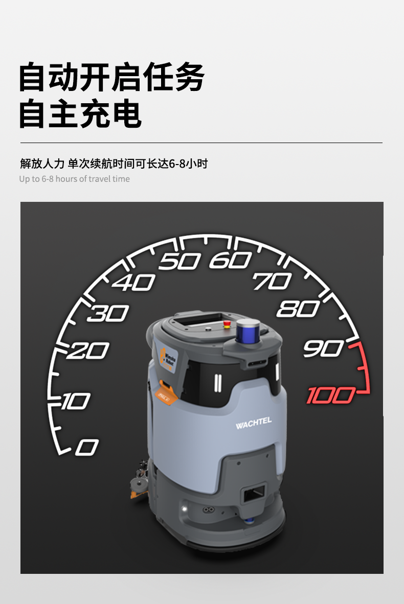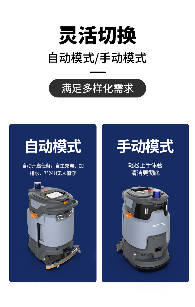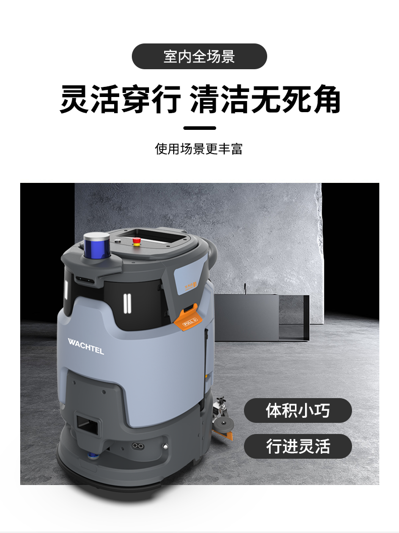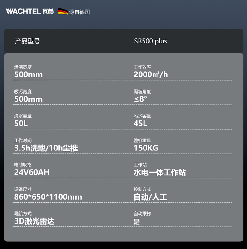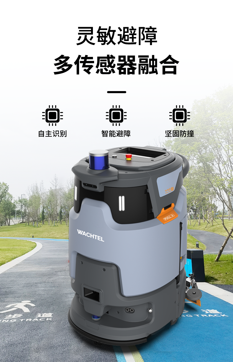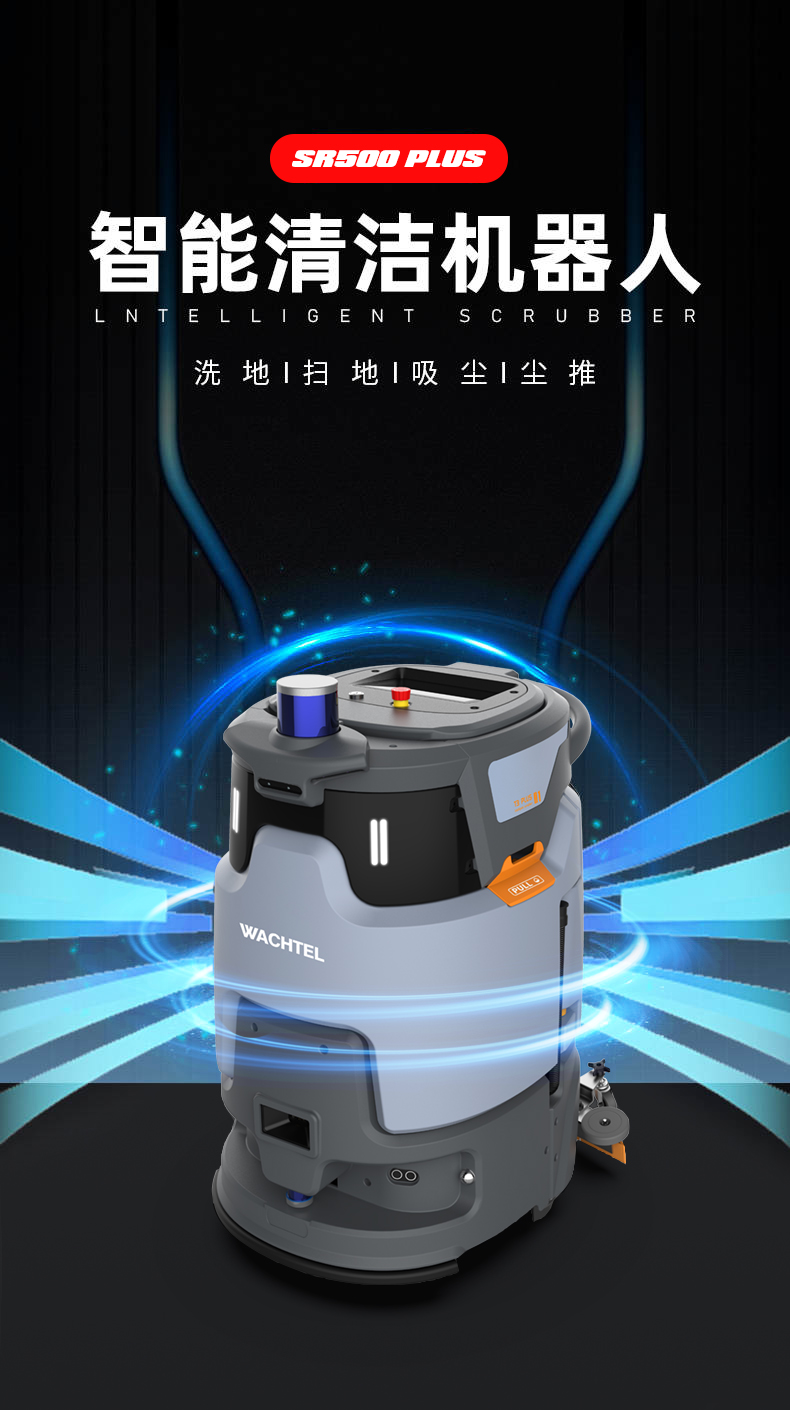 品牌:WACHTEL 名稱:智能洗地清潔機器人 型號:SR500 plus 功能:洗地+刷地+塵推+吸污 特點:自動充電+自動避讓+自動換水+自動乘梯+斷點續(xù)掃 模式:自動/人工 導航;3D激光雷達 工作站:水電一體工作站 外觀尺寸: 850*650*1100mm 清掃寬度:500 mm 吸污寬度:500 mm 清潔效率:2000m²/h 工作時間:3.5h洗地/10h塵推 電池:24V 重量:150kg